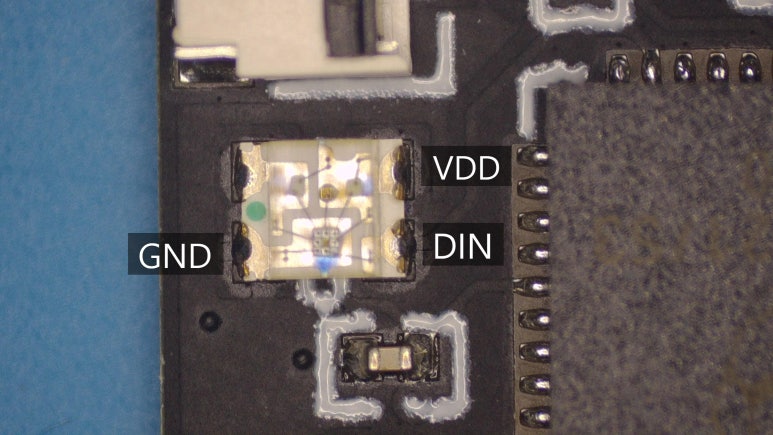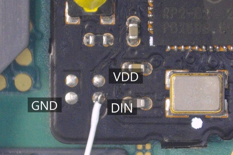 - PICOFLY칩에서 WS2812 적출하고, DIN포인트를 확인한다. (GND포인트의 반대편)